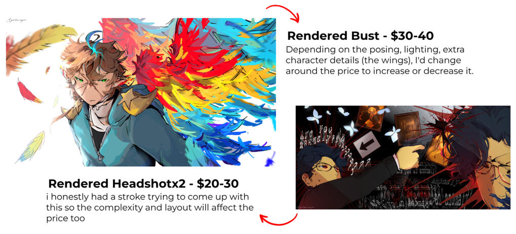 - provide character designs, poses reference (opt.), etc. or just explain it really good- specify a certain artstyle (because it changes alot)